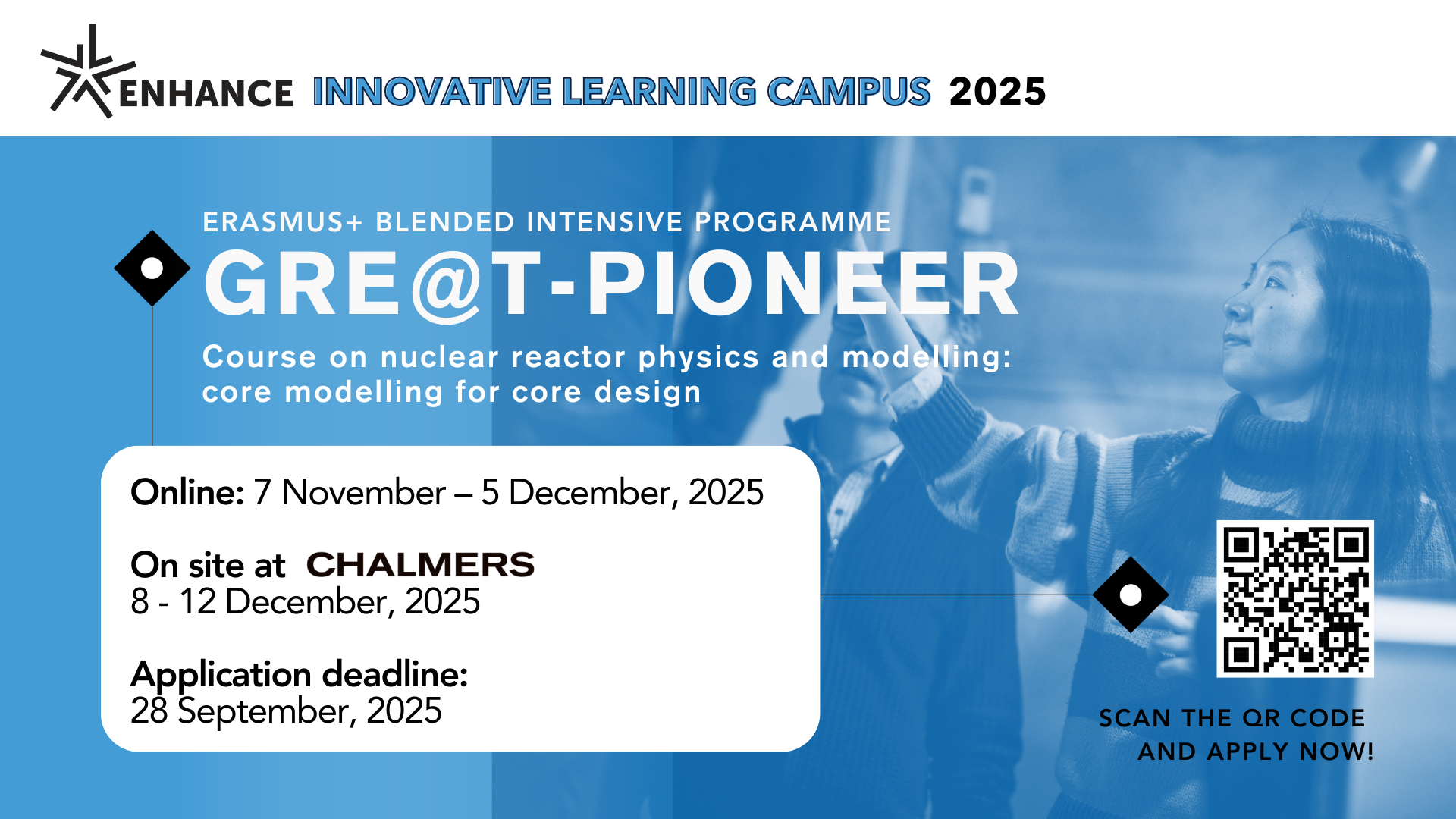 Kurs Computational Nuclear Reactor Physics (Blended Intensive Programme) zorganizowany przez Uniwersytet Techniczny Chalmersa w ramach ENHANCE dostarczy uczestnikom wiedzy, umiejętności i narzędzi do wykonywania obliczeń fizyki reaktorów w systemach reaktorów jądrowych.
